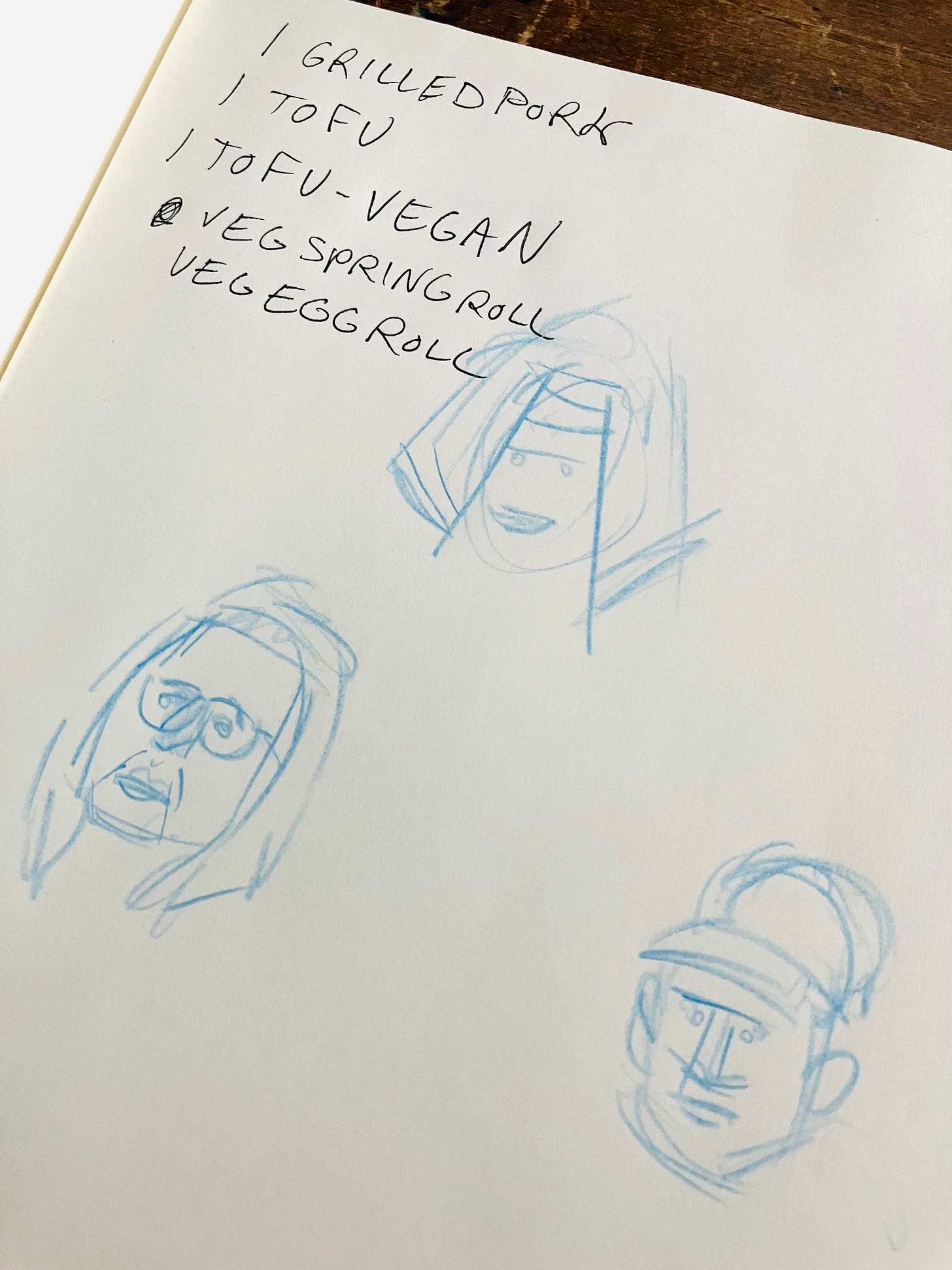 Starting a new sketchbook can be daunting. Sharing my work on social media can add a whole new level of anxiety, as the pressure to be cute and presentable for this unknown and assumed high-brow audience mounts. But my sketchbooks ain’t cute. They are dirty and ragged. Scribbly and smeared. There are grocery lists and food orders. Notes to self and half-baked ideas. Experiments. Failures. Failures are the best.